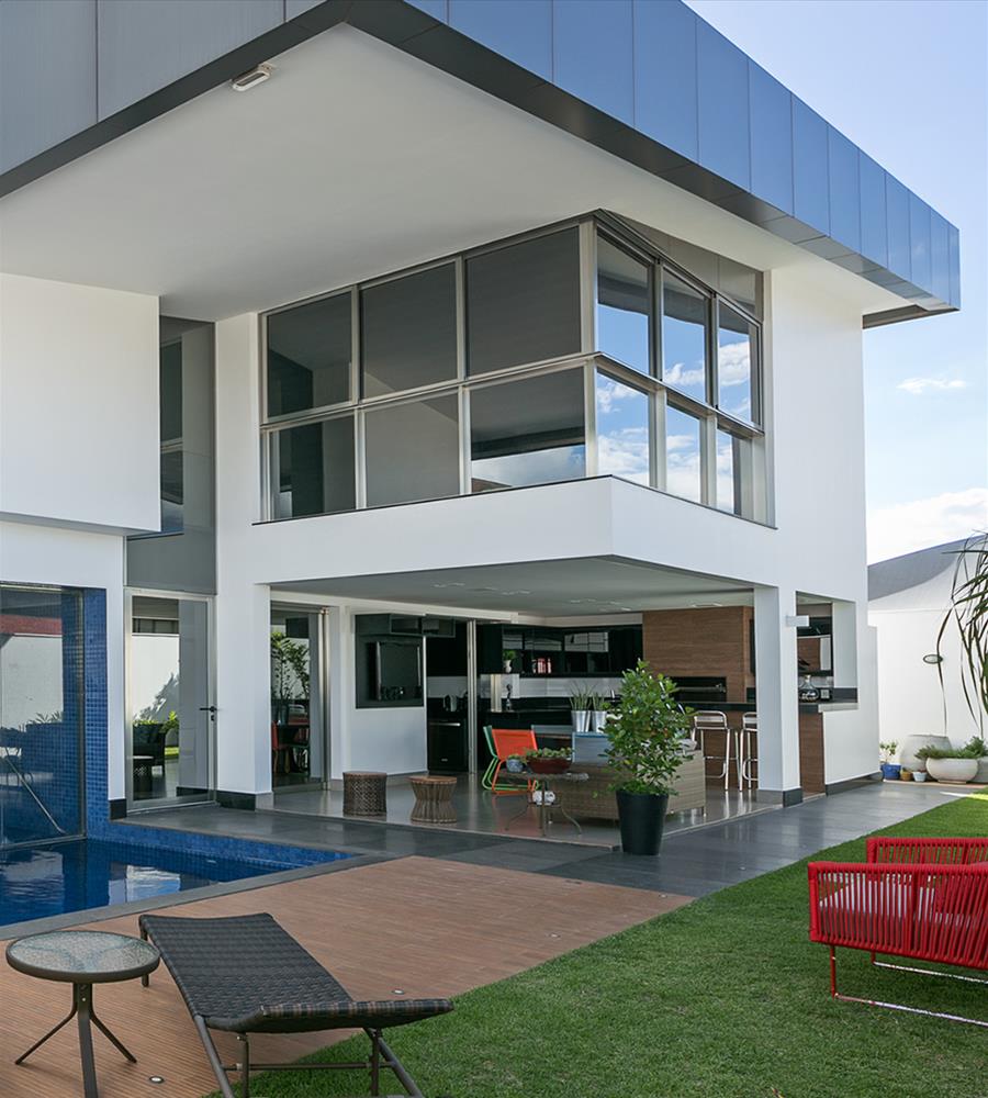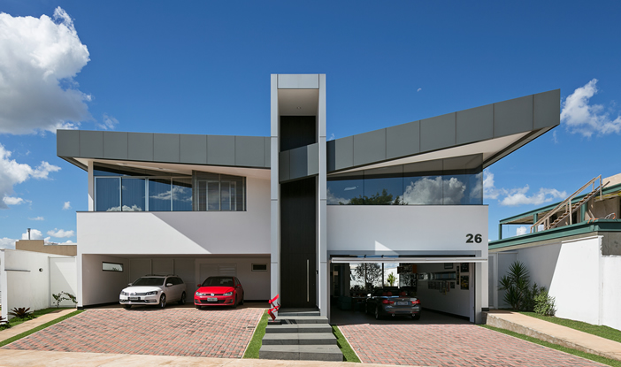 As fachadas ganharam destaque com o uso do ACM, um material composto de alumínio pouco usado em construções residenciais, mas que, neste projeto, faz alusão aos carros esportivos.