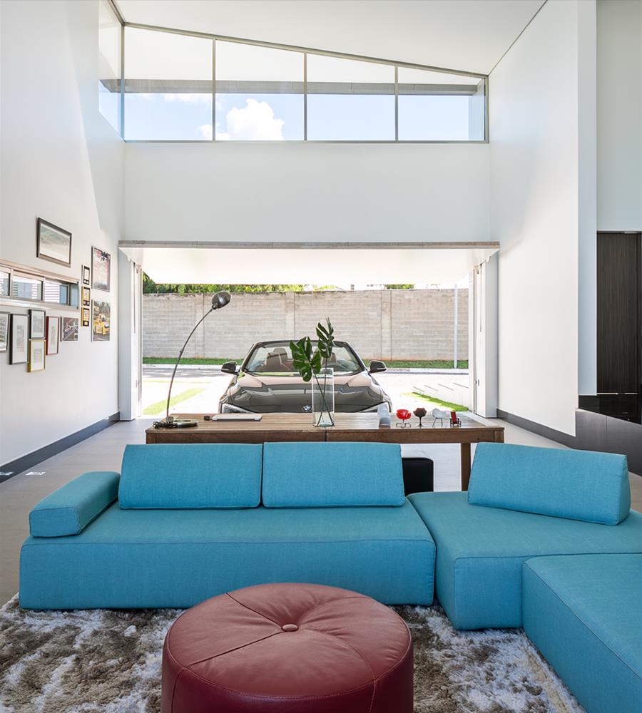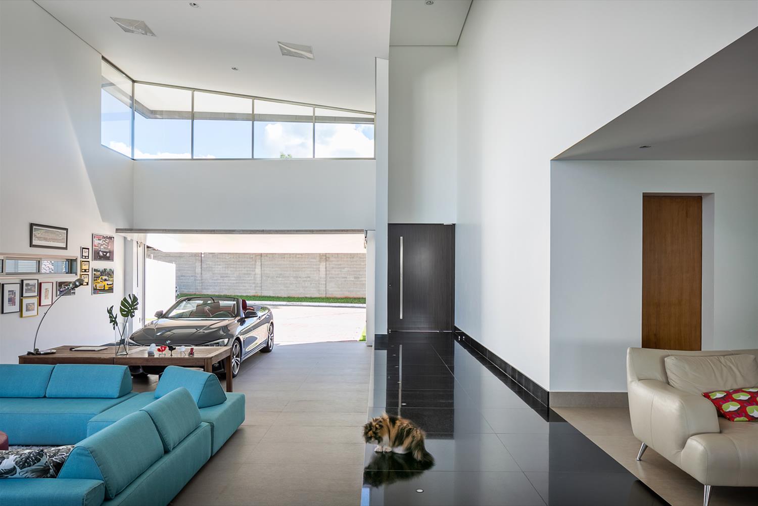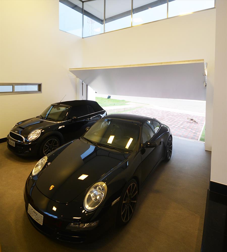 Seguindo o desejo dos proprietários, os arquitetos colocaram os carros no nível inferior ao restante do pavimento térreo, para que pudessem ser contemplados de qualquer ponto da casa, inclusive do pavimento superior, da área de lazer e da piscina. Desta forma, o projeto gira em torno desta ‘sala garagem’, que tem pé-direito duplo.