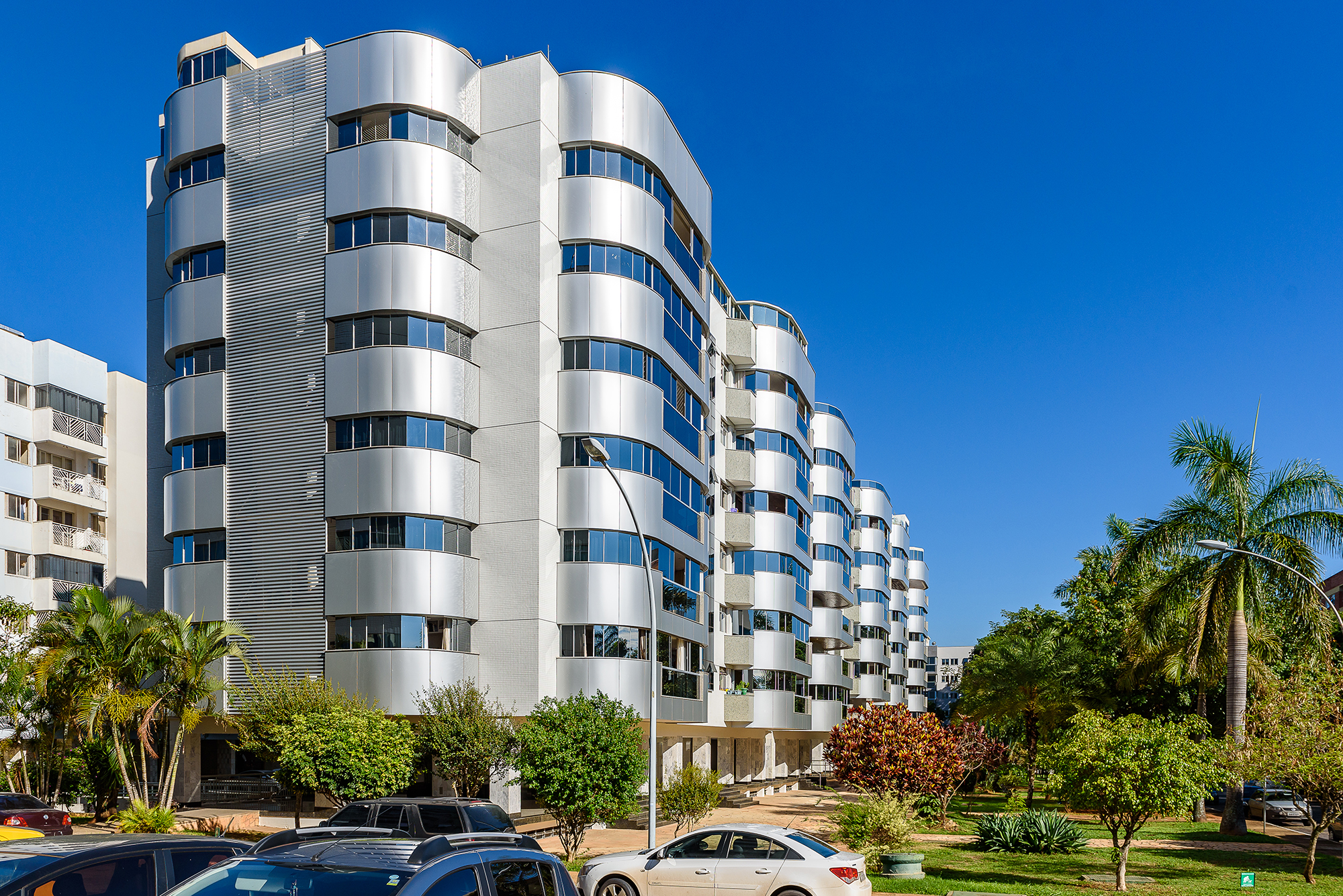 As varandas em balanço mantinham vícios construtivos que permitiam a penetração de aguas das chuvas. no apartamento. Como solução usamos revestimento ventilado em composto de alumínio, que caiu como uma luva nas curvas das fachadas. o resultado foi uma mudança completa no visual do edifício, que agora, não tem infiltração. E nunca mais terá.